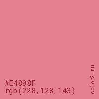 Цвет #E4808F в цветовой модели RGB обозначается тремя октетами (228, 128, 143) в десятичном формате и #E4808F в шестнадцатиричном (hex) формате, которые являются интенсивностью красного 228 (hex E4), интенсивность зелёного 128 (hex 80) и интенсивность синего 143 (hex 8F).