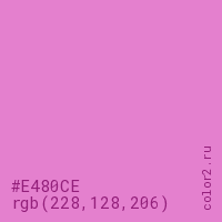 Цвет #E480CE в цветовой модели RGB обозначается тремя октетами (228, 128, 206) в десятичном формате и #E480CE в шестнадцатиричном (hex) формате, которые являются интенсивностью красного 228 (hex E4), интенсивность зелёного 128 (hex 80) и интенсивность синего 206 (hex CE).