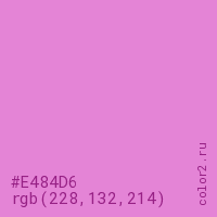 Цвет #E484D6 в цветовой модели RGB обозначается тремя октетами (228, 132, 214) в десятичном формате и #E484D6 в шестнадцатиричном (hex) формате, которые являются интенсивностью красного 228 (hex E4), интенсивность зелёного 132 (hex 84) и интенсивность синего 214 (hex D6).