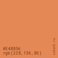 Цвет #E48856 в цветовой модели RGB обозначается тремя октетами (228, 136, 86) в десятичном формате и #E48856 в шестнадцатиричном (hex) формате, которые являются интенсивностью красного 228 (hex E4), интенсивность зелёного 136 (hex 88) и интенсивность синего 86 (hex 56).