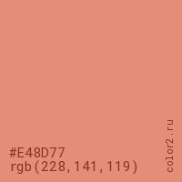 Цвет #E48D77 в цветовой модели RGB обозначается тремя октетами (228, 141, 119) в десятичном формате и #E48D77 в шестнадцатиричном (hex) формате, которые являются интенсивностью красного 228 (hex E4), интенсивность зелёного 141 (hex 8D) и интенсивность синего 119 (hex 77).