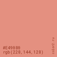 Цвет #E49080 в цветовой модели RGB обозначается тремя октетами (228, 144, 128) в десятичном формате и #E49080 в шестнадцатиричном (hex) формате, которые являются интенсивностью красного 228 (hex E4), интенсивность зелёного 144 (hex 90) и интенсивность синего 128 (hex 80).
