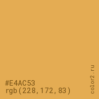 Цвет #E4AC53 в цветовой модели RGB обозначается тремя октетами (228, 172, 83) в десятичном формате и #E4AC53 в шестнадцатиричном (hex) формате, которые являются интенсивностью красного 228 (hex E4), интенсивность зелёного 172 (hex AC) и интенсивность синего 83 (hex 53).