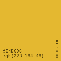 Цвет #E4B830 в цветовой модели RGB обозначается тремя октетами (228, 184, 48) в десятичном формате и #E4B830 в шестнадцатиричном (hex) формате, которые являются интенсивностью красного 228 (hex E4), интенсивность зелёного 184 (hex B8) и интенсивность синего 48 (hex 30).