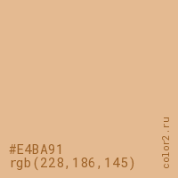 Цвет #E4BA91 в цветовой модели RGB обозначается тремя октетами (228, 186, 145) в десятичном формате и #E4BA91 в шестнадцатиричном (hex) формате, которые являются интенсивностью красного 228 (hex E4), интенсивность зелёного 186 (hex BA) и интенсивность синего 145 (hex 91).