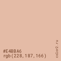 Цвет #E4BBA6 в цветовой модели RGB обозначается тремя октетами (228, 187, 166) в десятичном формате и #E4BBA6 в шестнадцатиричном (hex) формате, которые являются интенсивностью красного 228 (hex E4), интенсивность зелёного 187 (hex BB) и интенсивность синего 166 (hex A6).
