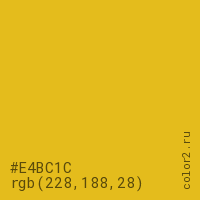Цвет #E4BC1C в цветовой модели RGB обозначается тремя октетами (228, 188, 28) в десятичном формате и #E4BC1C в шестнадцатиричном (hex) формате, которые являются интенсивностью красного 228 (hex E4), интенсивность зелёного 188 (hex BC) и интенсивность синего 28 (hex 1C).