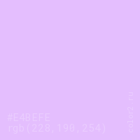 Цвет #E4BEFE в цветовой модели RGB обозначается тремя октетами (228, 190, 254) в десятичном формате и #E4BEFE в шестнадцатиричном (hex) формате, которые являются интенсивностью красного 228 (hex E4), интенсивность зелёного 190 (hex BE) и интенсивность синего 254 (hex FE).