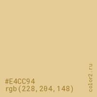 Цвет #E4CC94 в цветовой модели RGB обозначается тремя октетами (228, 204, 148) в десятичном формате и #E4CC94 в шестнадцатиричном (hex) формате, которые являются интенсивностью красного 228 (hex E4), интенсивность зелёного 204 (hex CC) и интенсивность синего 148 (hex 94).