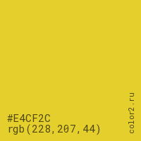 Цвет #E4CF2C в цветовой модели RGB обозначается тремя октетами (228, 207, 44) в десятичном формате и #E4CF2C в шестнадцатиричном (hex) формате, которые являются интенсивностью красного 228 (hex E4), интенсивность зелёного 207 (hex CF) и интенсивность синего 44 (hex 2C).