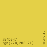 Цвет #E4D047 в цветовой модели RGB обозначается тремя октетами (228, 208, 71) в десятичном формате и #E4D047 в шестнадцатиричном (hex) формате, которые являются интенсивностью красного 228 (hex E4), интенсивность зелёного 208 (hex D0) и интенсивность синего 71 (hex 47).