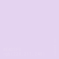Цвет #E4D3F0 в цветовой модели RGB обозначается тремя октетами (228, 211, 240) в десятичном формате и #E4D3F0 в шестнадцатиричном (hex) формате, которые являются интенсивностью красного 228 (hex E4), интенсивность зелёного 211 (hex D3) и интенсивность синего 240 (hex F0).