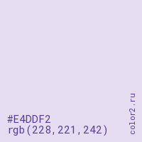 Цвет #E4DDF2 в цветовой модели RGB обозначается тремя октетами (228, 221, 242) в десятичном формате и #E4DDF2 в шестнадцатиричном (hex) формате, которые являются интенсивностью красного 228 (hex E4), интенсивность зелёного 221 (hex DD) и интенсивность синего 242 (hex F2).