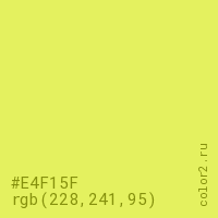 Цвет #E4F15F в цветовой модели RGB обозначается тремя октетами (228, 241, 95) в десятичном формате и #E4F15F в шестнадцатиричном (hex) формате, которые являются интенсивностью красного 228 (hex E4), интенсивность зелёного 241 (hex F1) и интенсивность синего 95 (hex 5F).