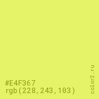 Цвет #E4F367 в цветовой модели RGB обозначается тремя октетами (228, 243, 103) в десятичном формате и #E4F367 в шестнадцатиричном (hex) формате, которые являются интенсивностью красного 228 (hex E4), интенсивность зелёного 243 (hex F3) и интенсивность синего 103 (hex 67).