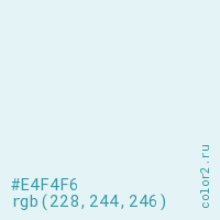 Цвет #E4F4F6 в цветовой модели RGB обозначается тремя октетами (228, 244, 246) в десятичном формате и #E4F4F6 в шестнадцатиричном (hex) формате, которые являются интенсивностью красного 228 (hex E4), интенсивность зелёного 244 (hex F4) и интенсивность синего 246 (hex F6).