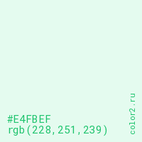 Цвет #E4FBEF в цветовой модели RGB обозначается тремя октетами (228, 251, 239) в десятичном формате и #E4FBEF в шестнадцатиричном (hex) формате, которые являются интенсивностью красного 228 (hex E4), интенсивность зелёного 251 (hex FB) и интенсивность синего 239 (hex EF).