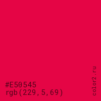 Цвет #E50545 в цветовой модели RGB обозначается тремя октетами (229, 5, 69) в десятичном формате и #E50545 в шестнадцатиричном (hex) формате, которые являются интенсивностью красного 229 (hex E5), интенсивность зелёного 5 (hex 05) и интенсивность синего 69 (hex 45).