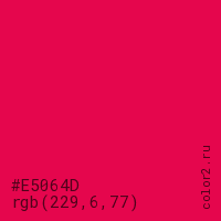 Цвет #E5064D в цветовой модели RGB обозначается тремя октетами (229, 6, 77) в десятичном формате и #E5064D в шестнадцатиричном (hex) формате, которые являются интенсивностью красного 229 (hex E5), интенсивность зелёного 6 (hex 06) и интенсивность синего 77 (hex 4D).