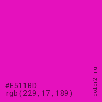 Цвет #E511BD в цветовой модели RGB обозначается тремя октетами (229, 17, 189) в десятичном формате и #E511BD в шестнадцатиричном (hex) формате, которые являются интенсивностью красного 229 (hex E5), интенсивность зелёного 17 (hex 11) и интенсивность синего 189 (hex BD).