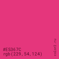 Цвет #E5367C в цветовой модели RGB обозначается тремя октетами (229, 54, 124) в десятичном формате и #E5367C в шестнадцатиричном (hex) формате, которые являются интенсивностью красного 229 (hex E5), интенсивность зелёного 54 (hex 36) и интенсивность синего 124 (hex 7C).