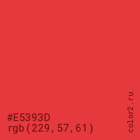 Цвет #E5393D в цветовой модели RGB обозначается тремя октетами (229, 57, 61) в десятичном формате и #E5393D в шестнадцатиричном (hex) формате, которые являются интенсивностью красного 229 (hex E5), интенсивность зелёного 57 (hex 39) и интенсивность синего 61 (hex 3D).