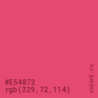 Цвет #E54872 в цветовой модели RGB обозначается тремя октетами (229, 72, 114) в десятичном формате и #E54872 в шестнадцатиричном (hex) формате, которые являются интенсивностью красного 229 (hex E5), интенсивность зелёного 72 (hex 48) и интенсивность синего 114 (hex 72).