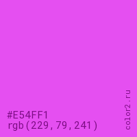 Цвет #E54FF1 в цветовой модели RGB обозначается тремя октетами (229, 79, 241) в десятичном формате и #E54FF1 в шестнадцатиричном (hex) формате, которые являются интенсивностью красного 229 (hex E5), интенсивность зелёного 79 (hex 4F) и интенсивность синего 241 (hex F1).