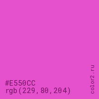 Цвет #E550CC в цветовой модели RGB обозначается тремя октетами (229, 80, 204) в десятичном формате и #E550CC в шестнадцатиричном (hex) формате, которые являются интенсивностью красного 229 (hex E5), интенсивность зелёного 80 (hex 50) и интенсивность синего 204 (hex CC).