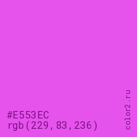 Цвет #E553EC в цветовой модели RGB обозначается тремя октетами (229, 83, 236) в десятичном формате и #E553EC в шестнадцатиричном (hex) формате, которые являются интенсивностью красного 229 (hex E5), интенсивность зелёного 83 (hex 53) и интенсивность синего 236 (hex EC).