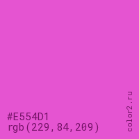 Цвет #E554D1 в цветовой модели RGB обозначается тремя октетами (229, 84, 209) в десятичном формате и #E554D1 в шестнадцатиричном (hex) формате, которые являются интенсивностью красного 229 (hex E5), интенсивность зелёного 84 (hex 54) и интенсивность синего 209 (hex D1).