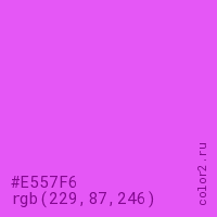 Цвет #E557F6 в цветовой модели RGB обозначается тремя октетами (229, 87, 246) в десятичном формате и #E557F6 в шестнадцатиричном (hex) формате, которые являются интенсивностью красного 229 (hex E5), интенсивность зелёного 87 (hex 57) и интенсивность синего 246 (hex F6).