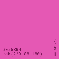 Цвет #E558B4 в цветовой модели RGB обозначается тремя октетами (229, 88, 180) в десятичном формате и #E558B4 в шестнадцатиричном (hex) формате, которые являются интенсивностью красного 229 (hex E5), интенсивность зелёного 88 (hex 58) и интенсивность синего 180 (hex B4).