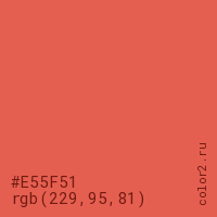 Цвет #E55F51 в цветовой модели RGB обозначается тремя октетами (229, 95, 81) в десятичном формате и #E55F51 в шестнадцатиричном (hex) формате, которые являются интенсивностью красного 229 (hex E5), интенсивность зелёного 95 (hex 5F) и интенсивность синего 81 (hex 51).