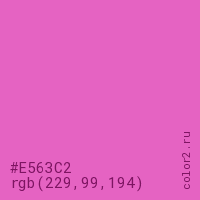 Цвет #E563C2 в цветовой модели RGB обозначается тремя октетами (229, 99, 194) в десятичном формате и #E563C2 в шестнадцатиричном (hex) формате, которые являются интенсивностью красного 229 (hex E5), интенсивность зелёного 99 (hex 63) и интенсивность синего 194 (hex C2).