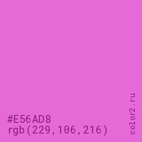 Цвет #E56AD8 в цветовой модели RGB обозначается тремя октетами (229, 106, 216) в десятичном формате и #E56AD8 в шестнадцатиричном (hex) формате, которые являются интенсивностью красного 229 (hex E5), интенсивность зелёного 106 (hex 6A) и интенсивность синего 216 (hex D8).