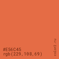 Цвет #E56C45 в цветовой модели RGB обозначается тремя октетами (229, 108, 69) в десятичном формате и #E56C45 в шестнадцатиричном (hex) формате, которые являются интенсивностью красного 229 (hex E5), интенсивность зелёного 108 (hex 6C) и интенсивность синего 69 (hex 45).