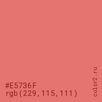 Цвет #E5736F в цветовой модели RGB обозначается тремя октетами (229, 115, 111) в десятичном формате и #E5736F в шестнадцатиричном (hex) формате, которые являются интенсивностью красного 229 (hex E5), интенсивность зелёного 115 (hex 73) и интенсивность синего 111 (hex 6F).
