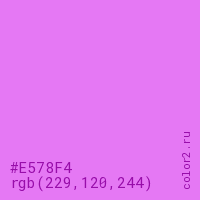Цвет #E578F4 в цветовой модели RGB обозначается тремя октетами (229, 120, 244) в десятичном формате и #E578F4 в шестнадцатиричном (hex) формате, которые являются интенсивностью красного 229 (hex E5), интенсивность зелёного 120 (hex 78) и интенсивность синего 244 (hex F4).