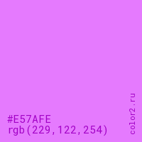 Цвет #E57AFE в цветовой модели RGB обозначается тремя октетами (229, 122, 254) в десятичном формате и #E57AFE в шестнадцатиричном (hex) формате, которые являются интенсивностью красного 229 (hex E5), интенсивность зелёного 122 (hex 7A) и интенсивность синего 254 (hex FE).