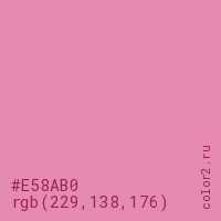 Цвет #E58AB0 в цветовой модели RGB обозначается тремя октетами (229, 138, 176) в десятичном формате и #E58AB0 в шестнадцатиричном (hex) формате, которые являются интенсивностью красного 229 (hex E5), интенсивность зелёного 138 (hex 8A) и интенсивность синего 176 (hex B0).