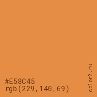 Цвет #E58C45 в цветовой модели RGB обозначается тремя октетами (229, 140, 69) в десятичном формате и #E58C45 в шестнадцатиричном (hex) формате, которые являются интенсивностью красного 229 (hex E5), интенсивность зелёного 140 (hex 8C) и интенсивность синего 69 (hex 45).