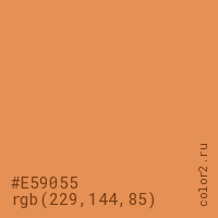Цвет #E59055 в цветовой модели RGB обозначается тремя октетами (229, 144, 85) в десятичном формате и #E59055 в шестнадцатиричном (hex) формате, которые являются интенсивностью красного 229 (hex E5), интенсивность зелёного 144 (hex 90) и интенсивность синего 85 (hex 55).