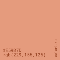 Цвет #E59B7D в цветовой модели RGB обозначается тремя октетами (229, 155, 125) в десятичном формате и #E59B7D в шестнадцатиричном (hex) формате, которые являются интенсивностью красного 229 (hex E5), интенсивность зелёного 155 (hex 9B) и интенсивность синего 125 (hex 7D).
