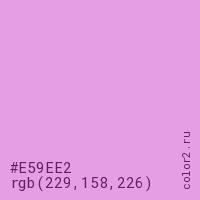 Цвет #E59EE2 в цветовой модели RGB обозначается тремя октетами (229, 158, 226) в десятичном формате и #E59EE2 в шестнадцатиричном (hex) формате, которые являются интенсивностью красного 229 (hex E5), интенсивность зелёного 158 (hex 9E) и интенсивность синего 226 (hex E2).