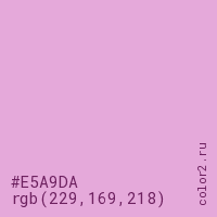 Цвет RGB(229, 169, 218) в процентом отношении количества цвета состоит из 89.8% красного (red), 66.3% зелёного (green) и 85.5% синего (blue).
