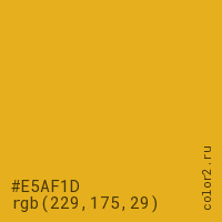 Цвет #E5AF1D в цветовой модели RGB обозначается тремя октетами (229, 175, 29) в десятичном формате и #E5AF1D в шестнадцатиричном (hex) формате, которые являются интенсивностью красного 229 (hex E5), интенсивность зелёного 175 (hex AF) и интенсивность синего 29 (hex 1D).