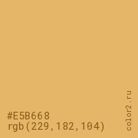Цвет #E5B668 в цветовой модели RGB обозначается тремя октетами (229, 182, 104) в десятичном формате и #E5B668 в шестнадцатиричном (hex) формате, которые являются интенсивностью красного 229 (hex E5), интенсивность зелёного 182 (hex B6) и интенсивность синего 104 (hex 68).