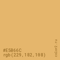 Цвет #E5B66C в цветовой модели RGB обозначается тремя октетами (229, 182, 108) в десятичном формате и #E5B66C в шестнадцатиричном (hex) формате, которые являются интенсивностью красного 229 (hex E5), интенсивность зелёного 182 (hex B6) и интенсивность синего 108 (hex 6C).
