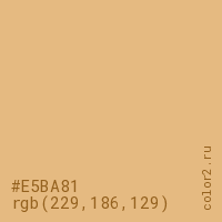 Цвет #E5BA81 в цветовой модели RGB обозначается тремя октетами (229, 186, 129) в десятичном формате и #E5BA81 в шестнадцатиричном (hex) формате, которые являются интенсивностью красного 229 (hex E5), интенсивность зелёного 186 (hex BA) и интенсивность синего 129 (hex 81).